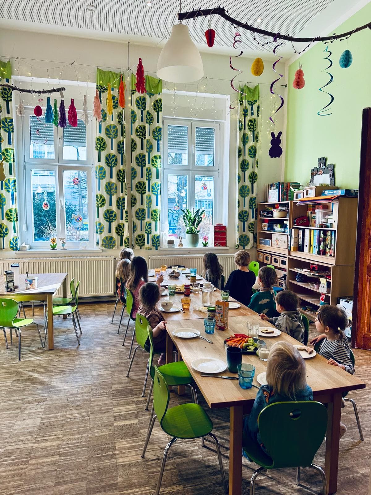 Nach der Mittagsruhe gibt es ein von uns zubereitetes Vesper — im Kinderladen oder draußen im Garten.