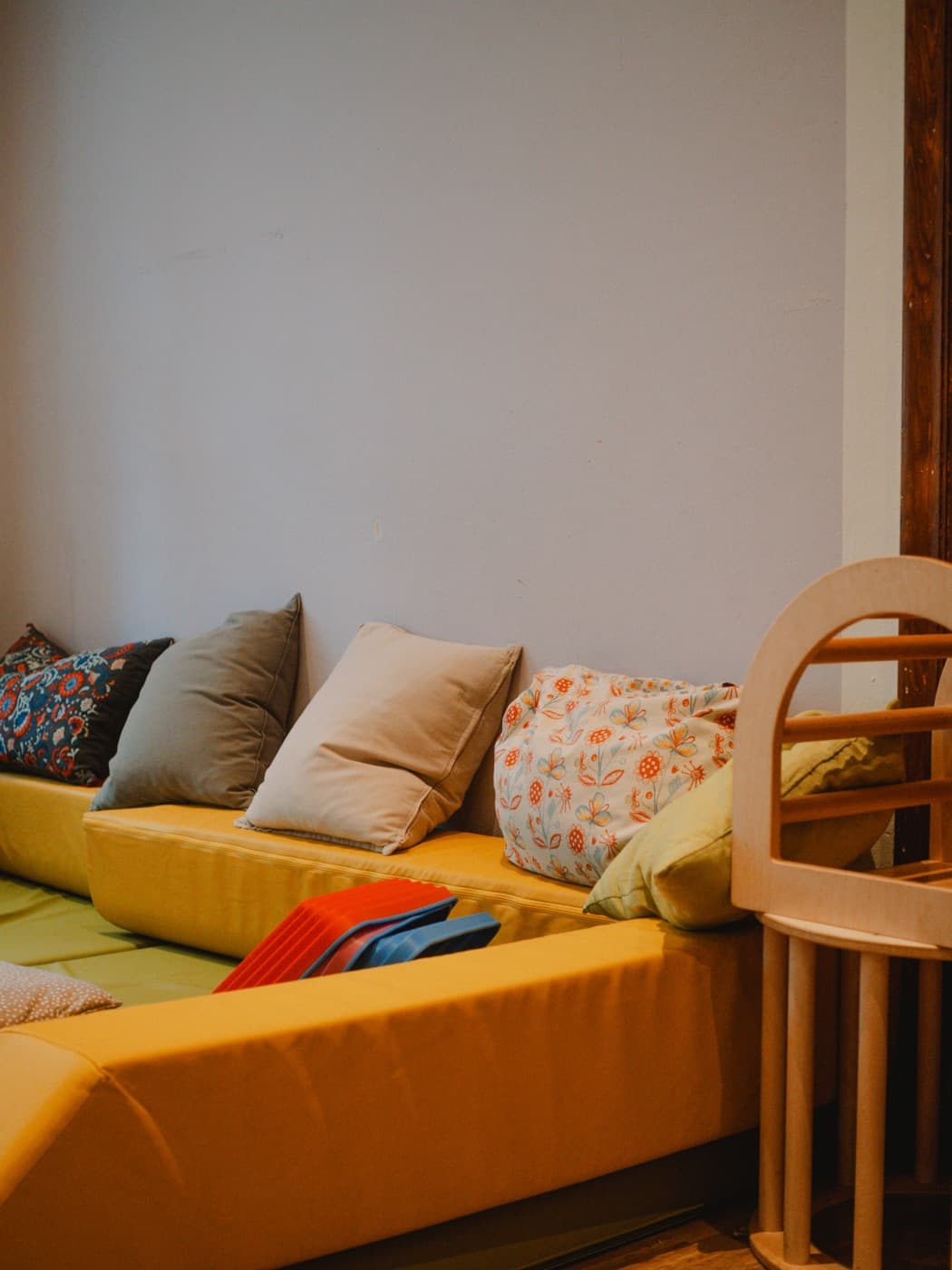 Je nach Alter und Wunsch: Vorleserunde, Entspannungsgeschichten und Traumreisen in der Kuschelecke oder Mittagsschlaf im Schlafraum.